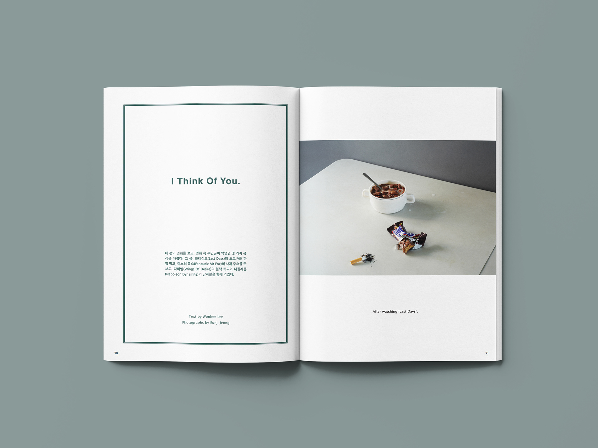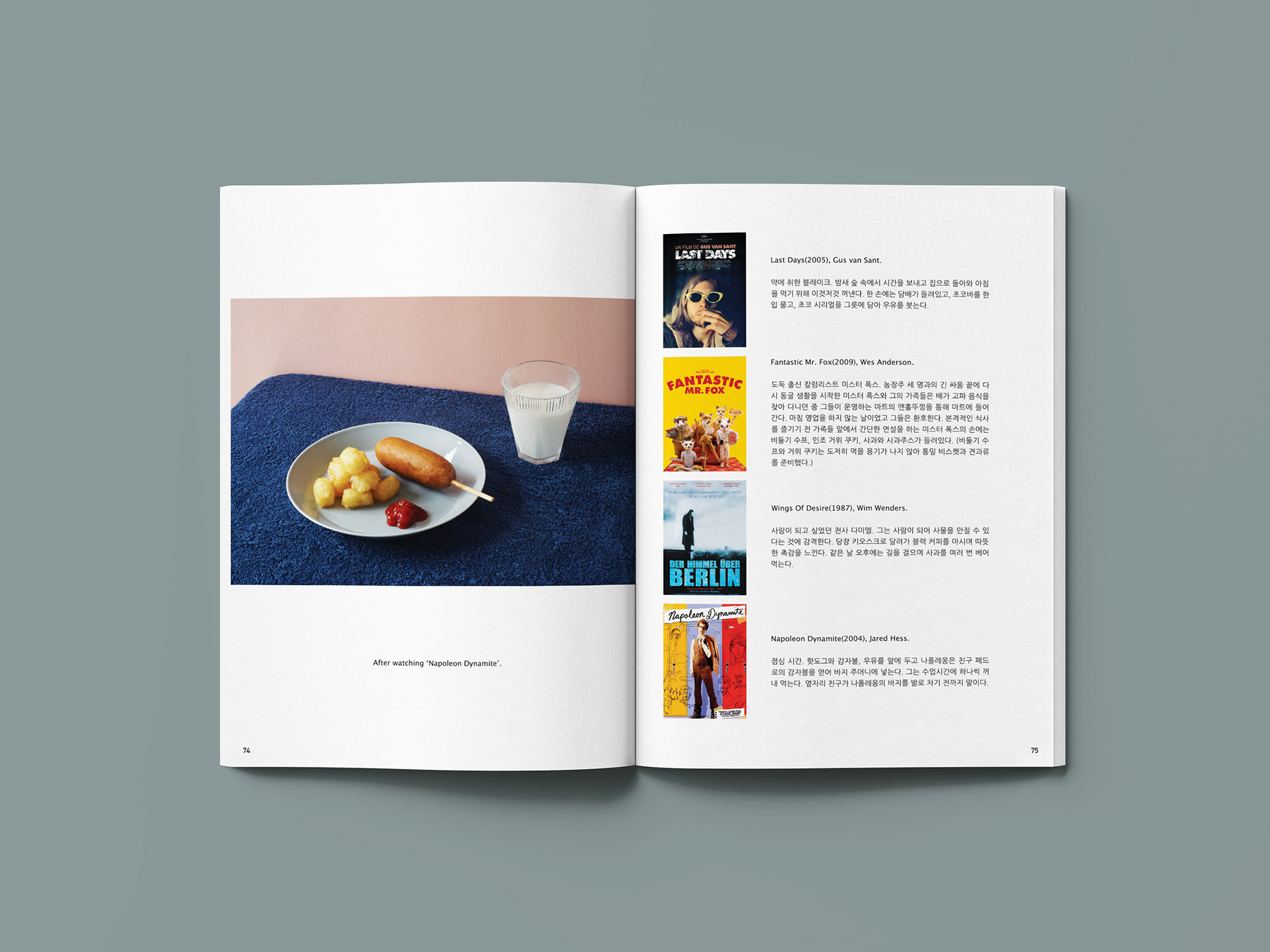 〈Last Days〉 속 블레이크의 초코바를 한 입 먹고, 〈Fantastic Mr.Fox〉 속 미스터 폭스의 사과주스를 맛보고, 〈Wings of Desire〉 속 다미엘의 블랙커피와 〈Napoleon Dynamite〉 속 나폴레옹의 감자볼을 함께 먹었습니다.